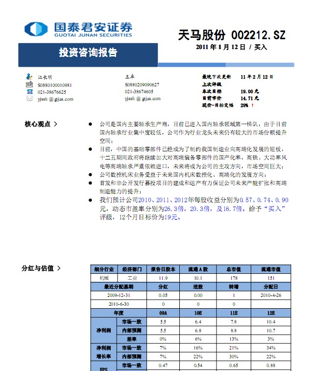 國(guó)泰君安研究報(bào)告:天馬股份(002122)投資咨詢(xún)報(bào)告:公司是國(guó)內(nèi)主要軸承生產(chǎn)商,目前已進(jìn)入國(guó)內(nèi)軸承領(lǐng)域第一梯隊(duì),由于目前國(guó)內(nèi)軸承行業(yè)集中度較低,公司作為行業(yè)龍頭未來(lái)仍有較大的市場(chǎng)份額提升空間;目前,中國(guó)的基礎(chǔ)零部件已經(jīng)成為了制約我國(guó)制造業(yè)向高端化發(fā)展的短板,十二五期間政府將繼續(xù)加大對(duì)高端裝備零部件的國(guó)產(chǎn)化率,高鐵、大功率風(fēng)電等高端軸承嚴(yán)重依賴(lài)進(jìn)口,未來(lái)將成為公司的主攻方向,市場(chǎng)空間巨大;公司數(shù)控機(jī)床業(yè)務(wù)受益于未來(lái)國(guó)內(nèi)機(jī)床數(shù)控化、高端化的發(fā)展方向;首發(fā)和非公開(kāi)發(fā)行募投項(xiàng)目的建成和達(dá)產(chǎn)有力保證公司未來(lái)產(chǎn)能擴(kuò)張和高端制造能力的提升;我們預(yù)計(jì)公司 2010 、 2011 、 2012 年每股收益分別為 0.57 、 0.74 、 0.90 元,動(dòng)態(tài)市盈率分別為 26.3 倍, 20.3 倍,及 16.7 倍。 給予 “ 買(mǎi)入 ” 評(píng)級(jí) , 12 個(gè)月目標(biāo)價(jià)為 19 元。公司是國(guó)內(nèi)主要軸承生產(chǎn)商 , 目前已穩(wěn)步進(jìn)入行業(yè)第一梯隊(duì) , 并在鐵路貨車(chē)輪軸和風(fēng)電軸承等領(lǐng)域具有穩(wěn)固的市場(chǎng)地位 。 在全世界軸承銷(xiāo)售額中 , 全球前八大跨國(guó)公司占據(jù) 80% 左右的份額 。 而我國(guó)瓦軸等 10 家最大的軸承企業(yè) , 銷(xiāo)售額僅占全行業(yè)的 25 %左右 。 隨著整個(gè)行業(yè)產(chǎn)品逐步向高端化發(fā)展 , 具有技術(shù)和市場(chǎng)優(yōu)勢(shì)的龍頭企業(yè)有望獲得更高的市場(chǎng)份額。十二五期間高鐵將迎來(lái)建設(shè)高峰 , 今年全國(guó)鐵路安排基本建設(shè)投 資 000 億元人民幣,為整個(gè)高鐵設(shè)備制造企業(yè)提供了巨大的市場(chǎng)機(jī)遇 , 但作為高鐵基礎(chǔ)零部件的高速列車(chē)軸承領(lǐng)域 , 瑞典 SKF 、 德國(guó) FAG 、 日 本 NTN 等國(guó)際巨頭正牢牢占據(jù)著中國(guó)市場(chǎng) 。 不僅是高鐵 , 風(fēng)電 、 機(jī)床主軸配套軸承等高端軸承一直是中國(guó)軸承業(yè)的軟肋 , 主要依靠進(jìn)口 。 工信部發(fā)布實(shí)施的 《 機(jī)械基礎(chǔ)零部件產(chǎn)業(yè)振興實(shí)施方案 》 中 , 軸承也位列基礎(chǔ)零部件的第一位,七個(gè)項(xiàng)目的軸承產(chǎn)品被納入 2011 年 — 2013 年的實(shí)施方案之中 。 公司作為軸承行業(yè)龍頭企業(yè) , 在政策大力扶持下 , 未來(lái)將主攻應(yīng)用于高鐵 、 風(fēng)電 、 航空 、 船舶 、 機(jī)床 、 重型機(jī)械等眾多領(lǐng)域的高端軸承,通過(guò)進(jìn)口替代使公司產(chǎn)品獲得更大的市場(chǎng)空間。國(guó)產(chǎn)機(jī)床目前約 30% 的數(shù)控化率和發(fā)達(dá)國(guó)家近 70% 的水平相差較大 , 導(dǎo)致目前國(guó)內(nèi)高端數(shù)控機(jī)床仍然主要被外資品牌占領(lǐng) , 未來(lái)隨著中高端裝備制造業(yè)的發(fā)展 , 中國(guó)機(jī)床行業(yè)的發(fā)展趨勢(shì)是低端產(chǎn)品需求將保持平穩(wěn)并占比下降 , 而中 、 高端產(chǎn)品需求會(huì)呈現(xiàn)較快增長(zhǎng) 。 根據(jù)國(guó)家科技重大專(zhuān)項(xiàng)之一《高端數(shù)控機(jī)床與基礎(chǔ)制造裝備》要求,到 2020 年我國(guó)將實(shí)現(xiàn)高檔數(shù)控機(jī)床主要立足于國(guó)內(nèi) , 航空航天 、 船舶 、 汽車(chē) 、 發(fā)電設(shè)備制造所需要的高檔數(shù)控機(jī)床與基礎(chǔ)制造裝備 80% 實(shí)現(xiàn)國(guó)產(chǎn)化 。 我們預(yù)計(jì) , 很長(zhǎng)一段時(shí)間 , 國(guó)產(chǎn)機(jī)床的數(shù)控化率將持續(xù)提升 , 公司控股的齊重?cái)?shù)控一致致力于重型機(jī)床的數(shù)控化 , 具有技術(shù)領(lǐng)先的優(yōu)勢(shì) , 目前產(chǎn)品數(shù)控化率已達(dá) 50% , 未來(lái)將充分受益于國(guó)內(nèi)機(jī)床高端化 、 數(shù)控化的發(fā)展趨勢(shì),增長(zhǎng)確定。公司上市以來(lái)募集資金兩次 , 目前已投資十多億新建的年產(chǎn) 500 萬(wàn)套精密球軸和高檔重型數(shù)控機(jī)床產(chǎn)業(yè)化項(xiàng)目已進(jìn)入試生產(chǎn)階段 , 今年即可投產(chǎn)運(yùn)營(yíng) , 公司產(chǎn)能將得到較大提升 。 同時(shí)公司近期還在進(jìn)一步加大對(duì)風(fēng)電軸承的技術(shù)改造以便進(jìn)入大功率風(fēng)電軸承領(lǐng)域,鐵路軸承方面 ,天馬股份通過(guò)引進(jìn)了一條國(guó)際最先進(jìn)的全自動(dòng)生產(chǎn)線(xiàn) , 以生產(chǎn)適應(yīng)未來(lái)高速鐵路貨車(chē)需求的軸承 。 這些項(xiàng)目的實(shí)施將使天馬股份不斷的提升高端鐵路、風(fēng)電、通用精密軸承以及高端重型數(shù)控機(jī)床等產(chǎn)品的產(chǎn)能 。 我們認(rèn)為伴隨這些產(chǎn)能的逐步釋放 , 以及公司技術(shù)水平的提升 , 公司未來(lái)業(yè)績(jī)?cè)鲩L(zhǎng)將有充分的保證。高鐵 、 大功率風(fēng)機(jī)等高端軸承的研發(fā) 、 試運(yùn)行并獲得最終的資質(zhì)認(rèn)證可能時(shí)間周期較長(zhǎng)并具有一定的不確定性......