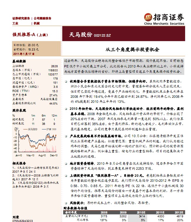 招商證券研究報告:天馬股份(002122)從三個角度揭示投資機會:收購整合齊重數(shù)控低于資本市場預期,但穩(wěn)步向好。雖然收購齊重數(shù)控后,浙江小民企和東北大國企的文化有沖突,管理層和部分技術人員出現(xiàn)流失,但目前已實現(xiàn)平穩(wěn)過渡。受益于產(chǎn)品結構優(yōu)化,齊重數(shù)控機床業(yè)務毛利率在 2008 年下降到 19.4%,今年中期已經(jīng)回升到 24.87%,凈利潤率已從 2008 年的 4%提高到 2010 年上半年的 13%。 010 年初開始,天馬股份風電軸承訂單快速回升,經(jīng)歷前兩年的降價,盈利基本啟穩(wěn)。2008 年金融危機后,風電軸承在外資品牌的帶領下,價格出現(xiàn)了 20%左右的下跌,2007 年風電軸承毛利率曾一度達到 50%以上,我們估算目前已回落到 35%左右。由于盈利擠壓,新的進入者減少,毛利率回歸正常,盈利基本穩(wěn)定。公司的競爭力表現(xiàn)在材料制造和企業(yè)管理。 產(chǎn)品發(fā)展戰(zhàn)略離不開拓展高端市場。公司 10月公告:擬在德清經(jīng)濟開發(fā)區(qū)臨杭工業(yè)園新建產(chǎn)業(yè)基地,擬經(jīng)營范圍:重型機械產(chǎn)品的制造。我們認為經(jīng)過兩年的調(diào)整,天馬已經(jīng)開始謀劃新一輪的擴張計劃,預計新公司的投資將圍繞戰(zhàn)略新興產(chǎn)業(yè),例如海上重型、核電行業(yè)的重型軸承,項目的進展取決于土地獲批的進程。 地方國資委增持。2010 年 8月公司高管在低點減持股份,隨后齊齊哈爾市國資委增持了天馬的股份,到三季度末持有約 2253 萬股。 上調(diào)投資評級至“強烈推薦—A”,目標價 20元?紤]到軸承業(yè)務觸底回升與齊重數(shù)控的整合效應逐步顯現(xiàn),我們預計天馬股份 2010-2012 年 EPS 為 0.58、0.70、0.85 元,2011 年動態(tài) PE 僅 22 倍,遠低于中小盤機械股 30 倍的平均估值。推薦天馬股份的理由一方是基于對基本面的判斷,另一方面齊齊哈爾國資委增持、重型項目上馬將成為股價上漲的催化劑。 風險提示:原材料成本上升、收購整合風險、再融資......