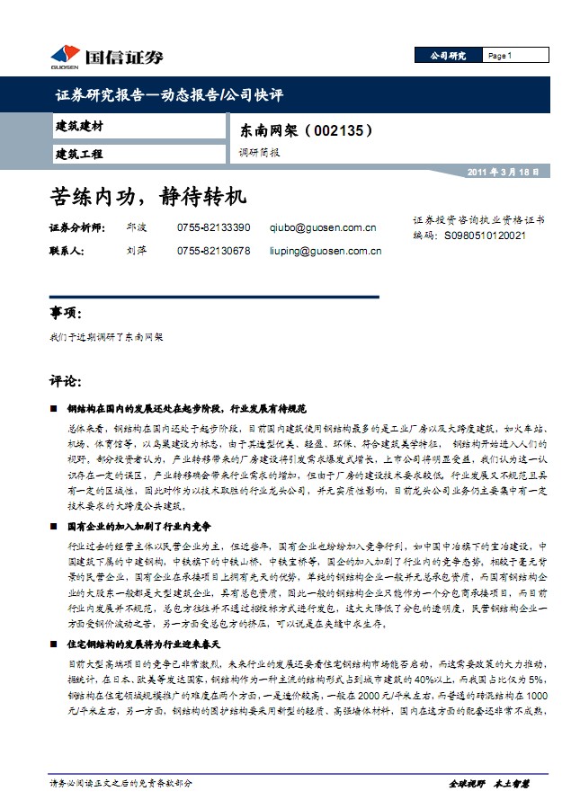 國信證券研究報告:東南網(wǎng)架(002135)苦練內(nèi)功,靜待轉(zhuǎn)機:鋼結(jié)構(gòu)在國內(nèi)的發(fā)展還處在起步階段,行業(yè)發(fā)展有待規(guī)范 總體來看,鋼結(jié)構(gòu)在國內(nèi)還處于起步階段,目前國內(nèi)建筑使用鋼結(jié)構(gòu)最多的是工業(yè)廠房以及大跨度建筑,如火車站、機場、體育館等,以鳥巢建設(shè)為標志,由于其造型優(yōu)美、輕盈、環(huán)保、符合建筑美學特征, 鋼結(jié)構(gòu)開始進入人們的視野。部分投資者認為,產(chǎn)業(yè)轉(zhuǎn)移帶來的廠房建設(shè)將引發(fā)需求爆發(fā)式增長,上市公司將明顯受益,我們認為這一認識存在一定的誤區(qū),產(chǎn)業(yè)轉(zhuǎn)移確會帶來行業(yè)需求的增加,但由于廠房的建設(shè)技術(shù)要求較低,行業(yè)發(fā)展又不規(guī)范且具有一定的區(qū)域性,因此對作為以技術(shù)取勝的行業(yè)龍頭公司,并無實質(zhì)性影響,目前龍頭公司業(yè)務(wù)仍主要集中有一定技術(shù)要求的大跨度公共建筑。 國有企業(yè)的加入加劇了行業(yè)內(nèi)競爭 行業(yè)過去的經(jīng)營主體以民營企業(yè)為主,但近些年,國有企業(yè)也紛紛加入競爭行列,如中國中冶旗下的寶冶建設(shè),中國建筑下屬的中建鋼構(gòu),中鐵旗下的中鐵山橋、中鐵寶橋等,國企的加入加劇了行業(yè)內(nèi)的競爭態(tài)勢。相較于毫無背景的民營企業(yè),國有企業(yè)在承接項目上擁有先天的優(yōu)勢,單純的鋼結(jié)構(gòu)企業(yè)一般并無總承包資質(zhì),而國有鋼結(jié)構(gòu)企業(yè)的大股東一般都是大型建筑企業(yè),具有總包資質(zhì),因此一般的鋼結(jié)構(gòu)企業(yè)只能作為一個分包商承接項目,而目前行業(yè)內(nèi)發(fā)展并不規(guī)范,總包方往往并不通過招投標方式進行發(fā)包,這大大降低了分包的透明度,民營鋼結(jié)構(gòu)企業(yè)一方面受鋼價波動之苦,另一方面受總包方的擠壓,可以說是在夾縫中求生存。 住宅鋼結(jié)構(gòu)的發(fā)展將為行業(yè)迎來春天 目前大型高端項目的競爭已非常激烈,未來行業(yè)的發(fā)展還要看住宅鋼結(jié)構(gòu)市場能否啟動,而這需要政策的大力推動,據(jù)統(tǒng)計,在日本、歐美等發(fā)達國家,鋼結(jié)構(gòu)作為一種主流的結(jié)構(gòu)形式占到城市建筑的40%以上,而我國占比僅為5%,鋼結(jié)構(gòu)在住宅領(lǐng)域規(guī)模推廣的難度在兩個方面,一是造價較高,一般在2000元/平米左右,而普通的磚混結(jié)構(gòu)在1000 元/平米左右,另一方面,鋼結(jié)構(gòu)的圍護結(jié)構(gòu)要采用新型的輕質(zhì)、高強墻體材料,國內(nèi)在這方面的配套還非常不成熟,目前國內(nèi)的路線是由鋼結(jié)構(gòu)企業(yè)自己生產(chǎn)墻體材料,但行業(yè)內(nèi)還沒有相關(guān)的標準。 未來大規(guī)模推廣鋼結(jié)構(gòu)住宅還需依賴政策的支持,相較于傳統(tǒng)建筑,鋼結(jié)構(gòu)有許多優(yōu)勢,首先鋼結(jié)構(gòu)建筑可以做為一種鋼的戰(zhàn)略儲備方式,我國是鋼鐵生產(chǎn)大國,鋼鐵總產(chǎn)能過剩,如果啟動鋼結(jié)構(gòu)住宅,則可以大量的消化鋼材,而鋼結(jié)構(gòu)建筑最后是可回收的,因此非常環(huán)保。其次鋼結(jié)構(gòu)可以工業(yè)化生產(chǎn)和標準化制作,這樣大量減少了現(xiàn)場施工操作,提高了生產(chǎn)效率,另外,其可回收、節(jié)能等優(yōu)點也符合未來建筑發(fā)展方向,從這幾個角度看,政府是有動力以政策推動行業(yè)發(fā)展的,但這可能還需要較長時間的等待。 公司的競爭優(yōu)勢在于技術(shù) 公司的競爭優(yōu)勢體現(xiàn)在技術(shù)上,公司是國內(nèi)唯一一家擁有國家級技術(shù)研發(fā)中心的鋼結(jié)構(gòu)企業(yè),公司已取得多項專利,盡管目前研發(fā)對公司的貢獻還未在利潤中體現(xiàn),但我們認為隨著行業(yè)的進一步發(fā)展以及行業(yè)招投標市場的進一步規(guī)范,公司的技術(shù)優(yōu)勢終將為公司賺取溢價。 增發(fā)項目符合行業(yè)未來發(fā)展趨勢 公司計劃以不低于 12.39 元的價格發(fā)行不超過 6000 萬股股票,募集 7.3 億元資金投向住宅鋼結(jié)構(gòu)項目和 9 萬噸新型建筑鋼結(jié)構(gòu)膜材建設(shè),我們在前文已分析過住宅鋼結(jié)構(gòu)是未來行業(yè)發(fā)展的最主要方向之一,公司目前建設(shè)生產(chǎn)線有望贏得先發(fā)優(yōu)勢,住宅鋼結(jié)構(gòu)市場一旦啟動,公司可快速切入市場,另外,公司的住宅鋼結(jié)構(gòu)與杭蕭鋼構(gòu)的有所區(qū)別,公司的技術(shù)路線是墻體材料主要實現(xiàn)工廠化的標準生產(chǎn),現(xiàn)場只需裝配,更符合行業(yè)未來的發(fā)展趨勢,而膜材目前國內(nèi)主要還是依賴進口,若公司募投順利實施則有望實現(xiàn)進口替代。 應收賬款管理已見成效 與同行業(yè)其它公司相比,公司在三費控制的表現(xiàn)上不盡人意, 2010年公司毛利率13.61%, 高于精工鋼構(gòu)的11.89%,但是公司凈利率僅為2.46%,大幅低于精工鋼構(gòu)的4.13%,主要是因為公司管理費用率為6.56%,遠高于精工鋼構(gòu)的3.55%,同時公司的資產(chǎn)減值損失也高于精工鋼構(gòu),公司從2010年開始加強了應收賬款的管理,年報來看,初見成效,而公司在提升管理效率、降低管理費用率方面還有很大的空間。 行業(yè)發(fā)展仍需等待政策驅(qū)