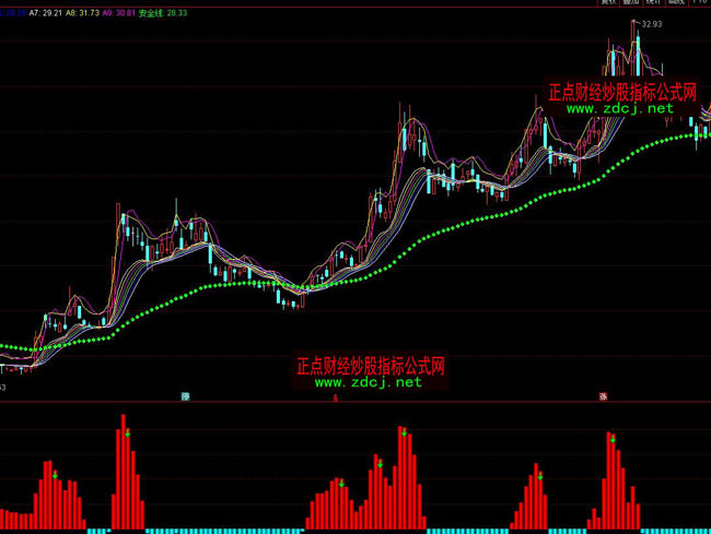 A、當(dāng)“神奇中線”、“神奇短線”發(fā)出買入信號時,如果K線在“安全線”(綠色)之下,可以試建倉,做反彈,但必須快進快出;一旦K線站在“安全線”(綠色)之上,并且有成交量的配合即可加碼建倉,此時為較佳的買點。然后可看長做短,一路持股并等待短線指標或“神奇中線”或“神奇短線”發(fā)出賣出信號,然后回避短線調(diào)整或清倉離場。“神奇均線”的特色功能,除能實時提示相對安全的“買點”之外,非常重要的是它從A1~A7的形態(tài)特征上可以清晰的作出判斷其基本的“趨勢”是上升還是下降。在具體操作中我們可以““神奇中線”(A1~A7)不封閉,繼續(xù)持股不持幣”的原則確定是否繼續(xù)持股待漲